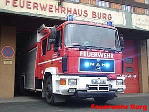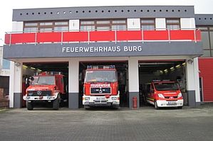 ![]() | Hervorgegangen aus einer Pflichtfeuerwehr, in der nach damaligem Gesetz alle männlichen Bewohner eines Ortes im Alter von 18 bis 45 Jahren Mitglied sein mussten, wurde 1894 die Freiwillige Feuerwehr Burg gegründet, die sich heute aus den ca. 30 aktiven Mitgliedern der Einsatzabteilung zusammensetzt. Geübt wird immer freitags in der Zeit von 19:00 bis 21:00, in der das von vielen Kräften auf Lehrgängen erworbene Fachwissen an die Mannschaft weitergegeben wird, um den hohen Ausbildungsstand der Wehr zu gewährleisten und auszubauen. |